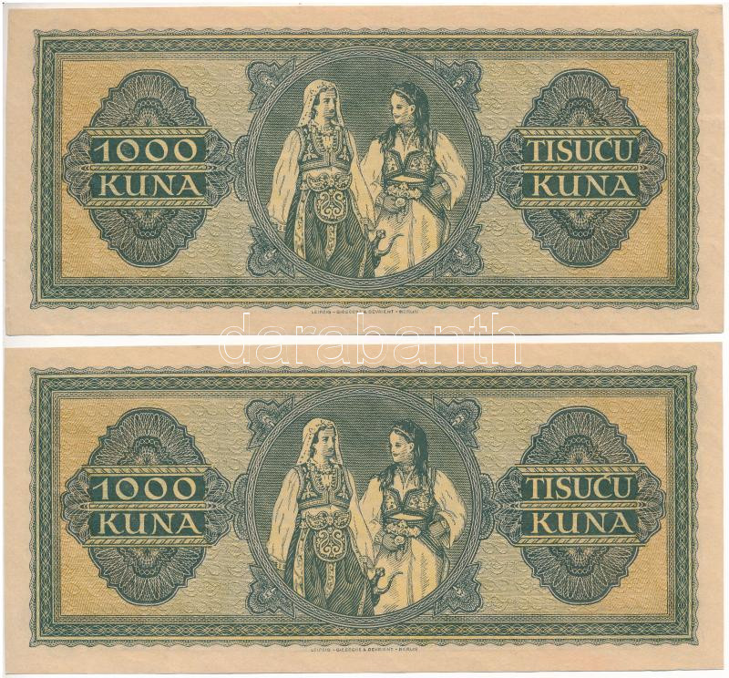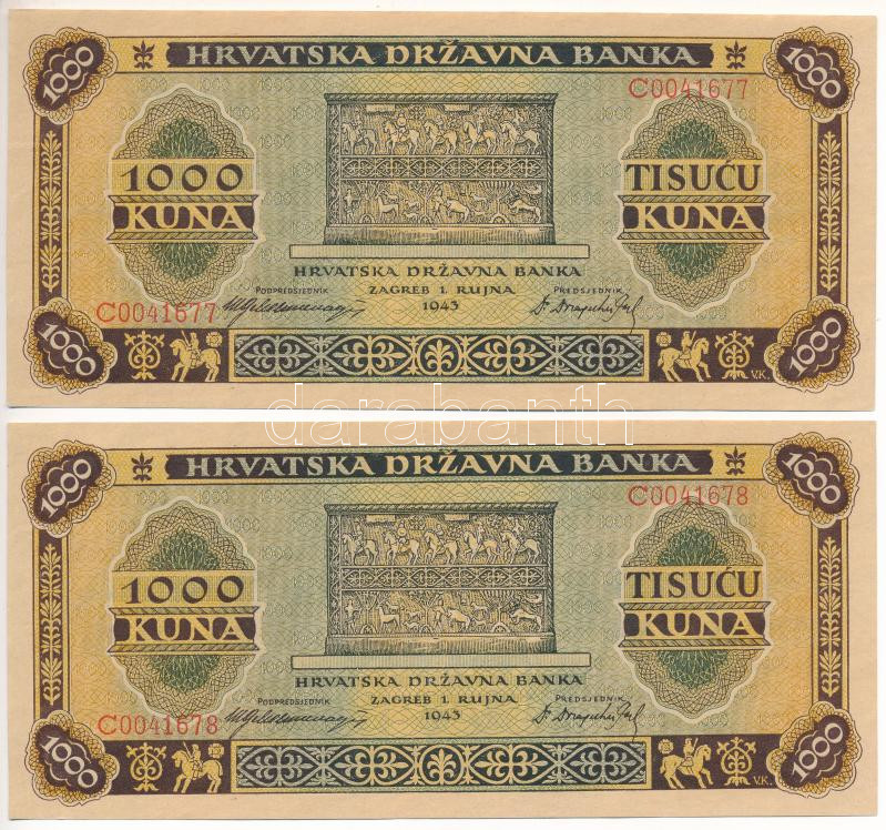 Független Horvát Állam 1943. 1000K (2x) sorszámkövetők "C 0041677 - C 0041678" T:I-