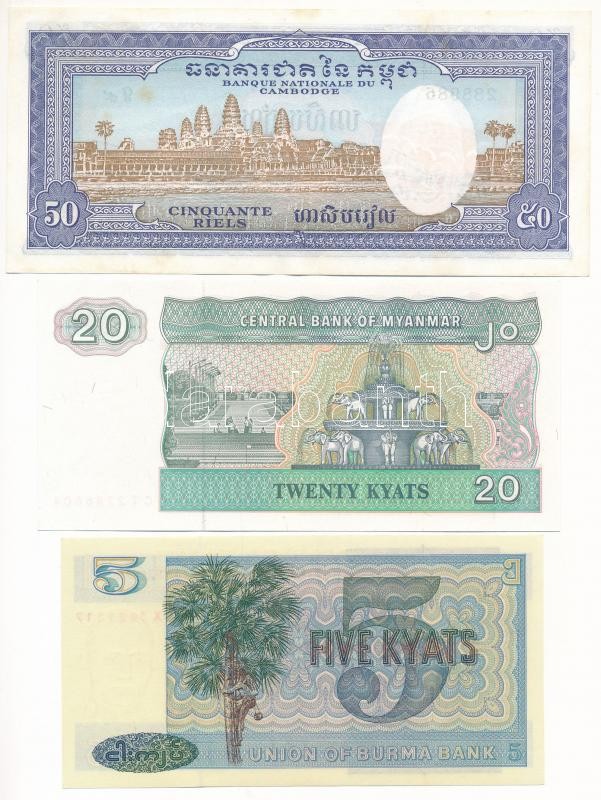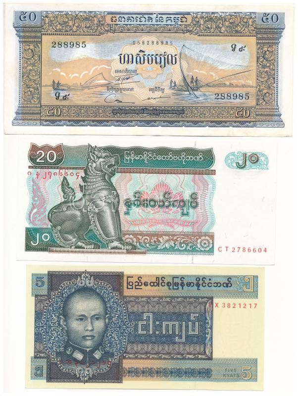 Beschreibung: Kambodzsa DN (1972) 50R + 2001. 100R + Mianmar / Burma 1973. 5K + DN (1994) 20K + DN (1997) 5K T:I,I- az egyiken folt