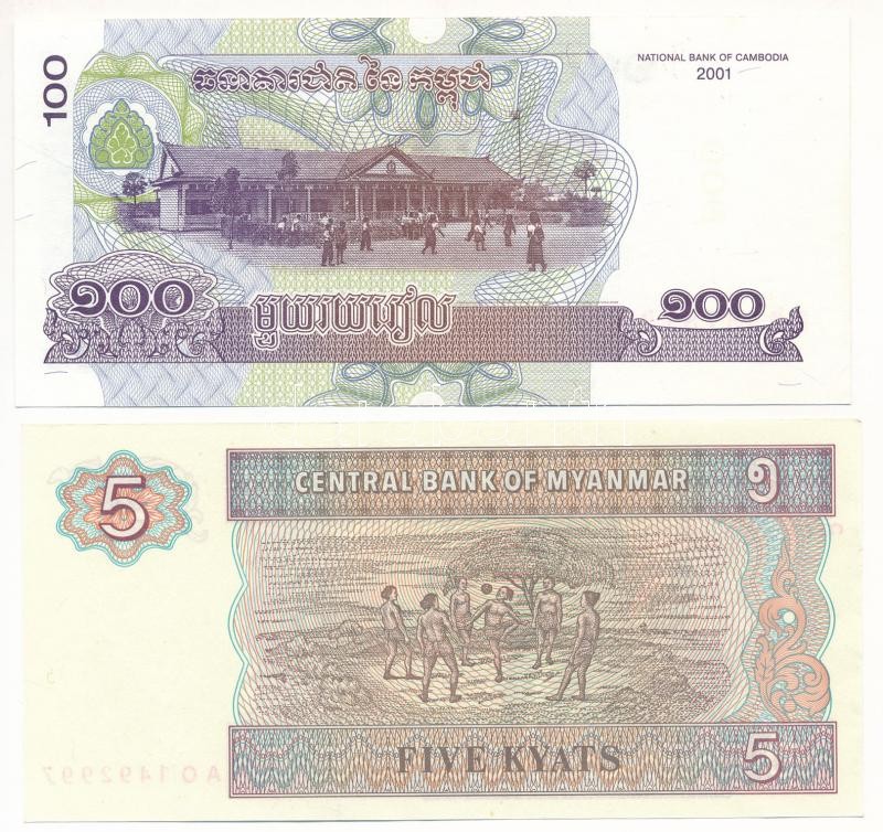 Cambodia ND (1972) 50 Riels + 2001. 100 Riels + Myanmar / Burma 1973. 5 Kyats + ND (1994) 20 Kyats + ND (1997) 5 Kyats C:UNC,AU spot on one of them