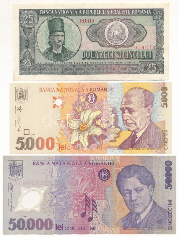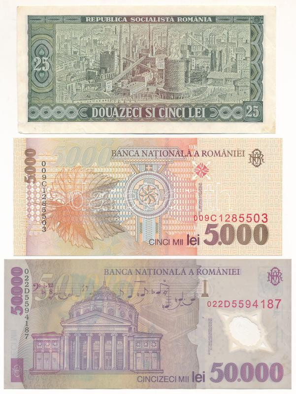 Románia 1966. 25L + 1998. 5000L + 2001. 50.000L T:I--III
