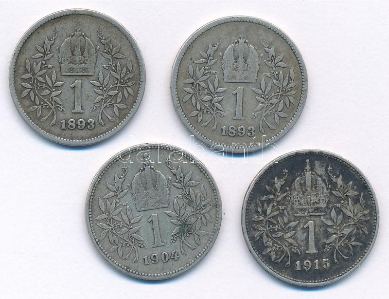 Austria 1893. 1 Corona Ag "Franz Joseph" (2x) + 1904. 1 Corona Ag "Franz Joseph" + 1915. 1 Corona Ag "Franz Joseph" C:VF,F patina