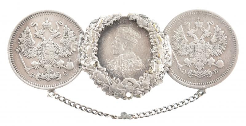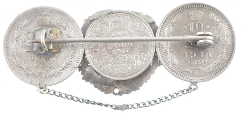Brit-India 1917. 2A Ag "V. György" + Orosz Birodalom 1907-1914. 10k Ag (2xklf) mindhárom érme összeforrasztva és brossá alakítva T:2