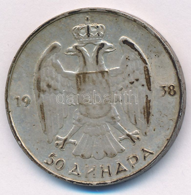 Jugoszlávia 1938. 50D Ag "II. Péter" T:2- patina Yugoslavia 1938. 50 Dinara Ag "Petar II" C:VF patina Krause KM#24