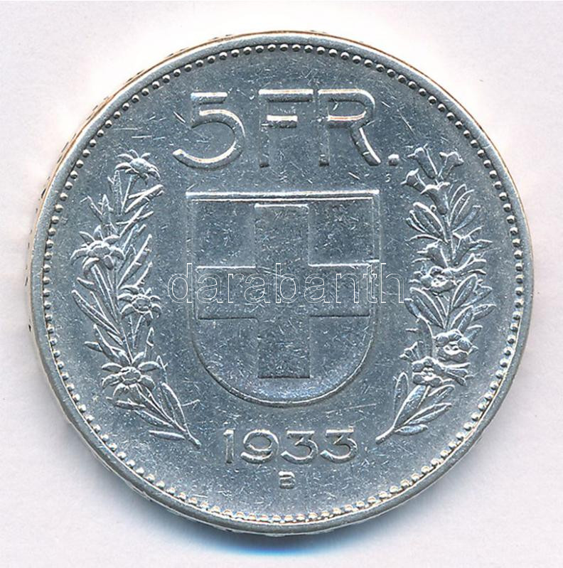 Svájc 1933. 5Fr Ag T:2,2- Switzerland 1933. 5 Francs Ag C:XF,VF Krause... https://www.darabanth.com/de/428-Fernauktion/428.0/Numismatik/Weltweit-Munzen~3000014/Svajc-1933-5Fr-Ag-T2-2-Switzerland-1933-5-Francs-Ag-CXF-VF-Krause-KM2340~II2742123