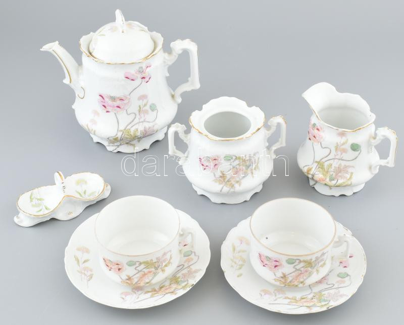 Beschreibung: Szecessziós porcelán teás készlet. Két személyes, hiányos + sótartó. Kézzel festett, jelzés nélkül, kopással.
