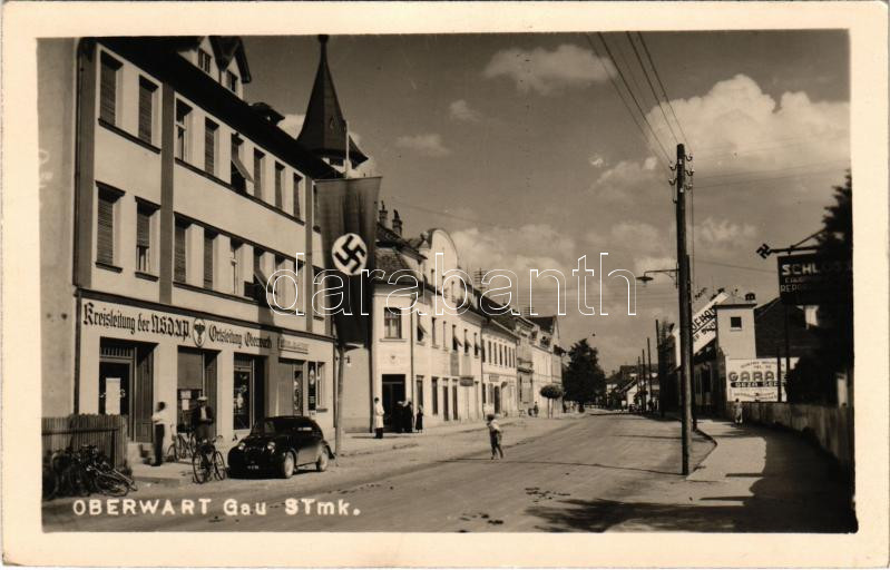 Felsőőr, Oberwart; Kreisleitung der NSDAP Ortsleitung Oberwarth / utca, Nemzetiszocialista (náci) Német Munkáspárt kerületi vezetőségének irodája, horogkeresztes zászló, Andreas Kelemen üzlete, automobil, kerékpár, autógarázs / street view, NSDAP German Nazi Party's district office, swastika flag, shops, automobile, bicycles, auto garage. L. Lottes (Wien) photo