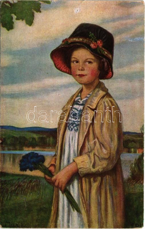 Beschreibung: 1923 Kornblumen / Children art postcard, girl with flower. Hanfstaengl's Küntlerkarte Nr. 45. s: Corn. Max (b)