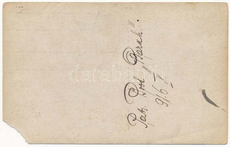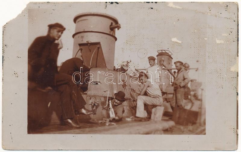 1916 Barsch őrnaszád, Dunaflottilla, matrózok szerelés közben a fedélzeten miután a románok belőtték / K.u.K. Kriegsmarine Donauflottille / Hungarian Danube Fleet river guard ship, mariners repairing on board after Romanian destruction. photo (EM)