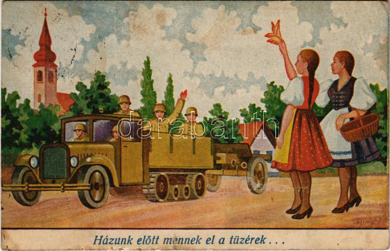 1943 Házunk előtt mennek el a tüzérek... / WWII Hungarian military art... https://www.darabanth.com/de/429-Fernauktion/429.0/Ansichtskarten/Militaria~1500084/1943-Hazunk-elott-mennek-el-a-tuzerek-WWII-Hungarian-military-art-postcard-folklore-s-Klu~II2748711