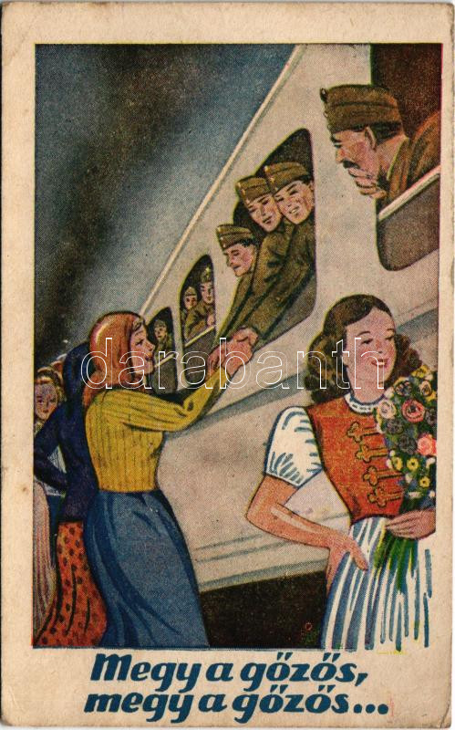 Beschreibung: 1944 Megy a gőzös, megy a gőzös... / WWII Hungarian military art postcard, soldiers' farewell at the railway station, folklore (EK)