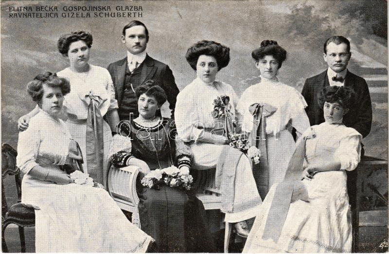 Beschreibung: Elitna Becka Gospojinska Glazba, Ravnateljica Gizela Schuberth. Klise i tisak Dionicke tiskare u Zagrebu / Elite Viennese Lady Music, Director Gizela Schuberth / Bécsi Elit Hölgy Zenekar az igazgatónővel (EK)