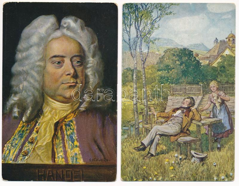 Beschreibung: 2 db RÉGI B.K.W.I. Wiener Kunst képeslap zeneszerzőkről: Handel, Schubert