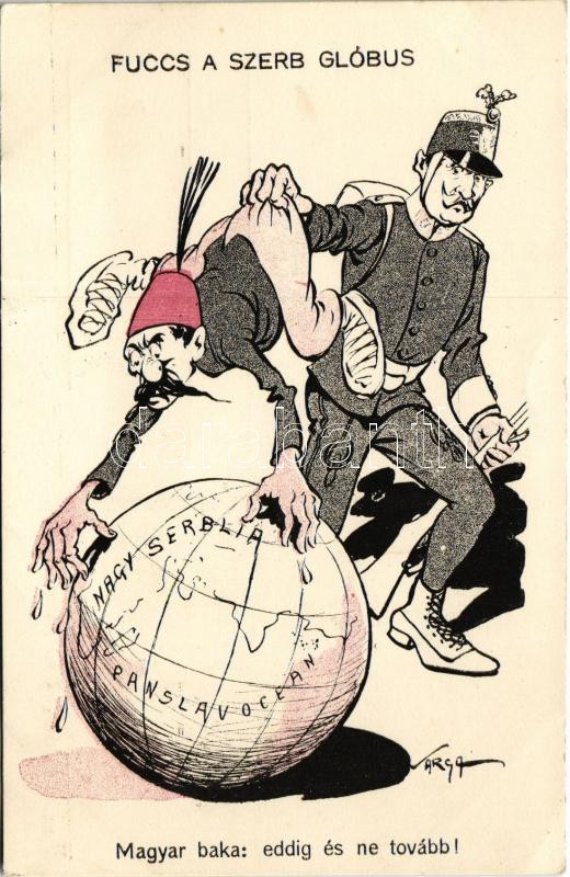 Fuccs a szerb glóbus - Magyar baka: eddig és ne tovább! Péter szerb király, első világháborús gúnyos szerbellenes propaganda. Klopfer 12. / WWI Anti-Serbian mmilitary mocking propaganda, caricature of Peter I of Serbia s: Varga (EK)