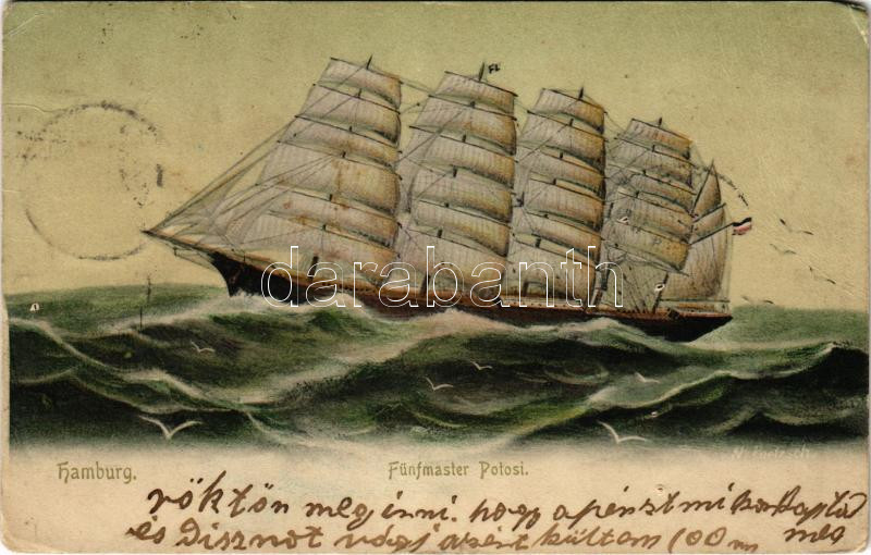 1903 Hamburg, Fünfmaster Potosi / German five-masted steel barque s: N... https://www.darabanth.com/de/429-Fernauktion/429.0/Ansichtskarten/Schiffe~1500078/1903-Hamburg-Funfmaster-Potosi-German-five-masted-steel-barque-s-N-Poetzsch-b~II2751323