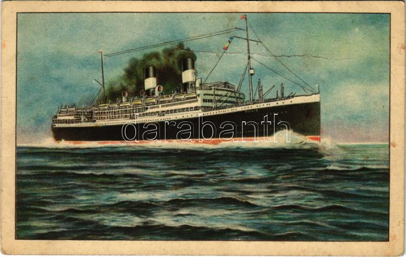 Beschreibung: SS Duilio 24300 tonnás, olajjal fűtött, 4 csavaros, óceánjáró luxusgőzös, sebessége óránként 21 csomó - N.G.I. (Navigazione Generale Italiana) Budapest, Fiumei út 3. (gyűrődés / crease)