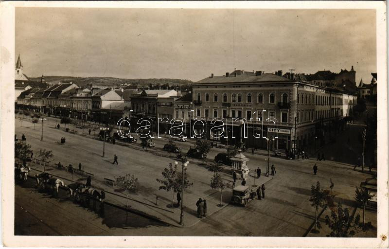 1940 Marosvásárhely, Targu Mures; Fő tér, automobilok, Transilvania szálloda, Boskovics Ferenc, Kalap Király üzlete, City cukrászda, Szabó Sándor étterme / main square, automobiles, hotel, shops, confectionery, restaurant (EK)