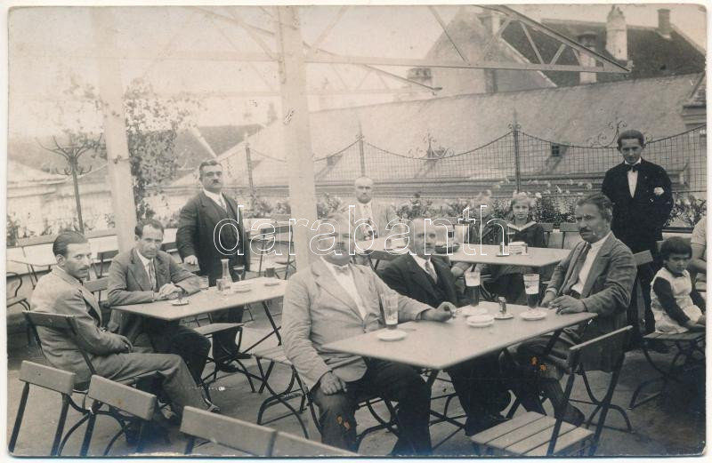 1932 Nagyszombat, Tyrnau, Trnava; Hostinec Ku kominárovi na Chlebovom rínku / Tóth József Vendéglője a kéményseprőhöz, étterem tető terasza / restaurant, rooftop terrace. photo (fl)