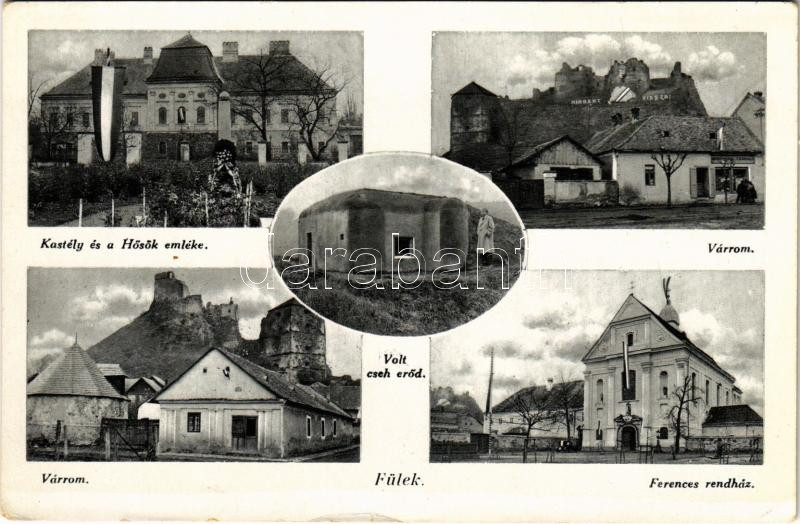 Fülek, Filakovo; Stefani kastély, Hősök emléke, Országzászló, Volt cseh erőd (betonbunker), várrom "Mindent vissza!" irredenta propaganda felirattal, Ferences rendház / castle, military monument, Hungarian flag, Czech concrete bunker, castle ruins with irredenta propaganda, Franciscan monastery (EK)
