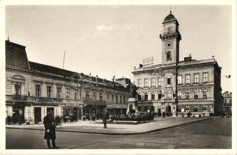 Kassa, Kosice; Klapka tér, Városháza, Klapka György szobor, Csonka, Lajosy, Klein Mór üzlete, Takarékpénztár / square, town hall, statue, shops, savings bank