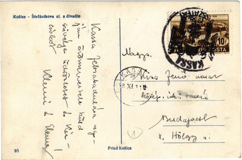 Beschreibung: Kassa, Kosice; Stefánikova ul. a divadlo / Stefánik utca, üzletek, színház / street view with shops and theater + 1938 Kassa visszatért So. Stpl.