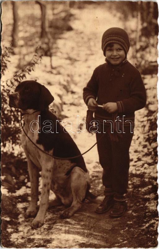 Beschreibung: Nagybiccse, Nagy-Bittse, Velká Bytca, Bytca; gyerek kutyával télen / child with dog in winter. photo (EK)