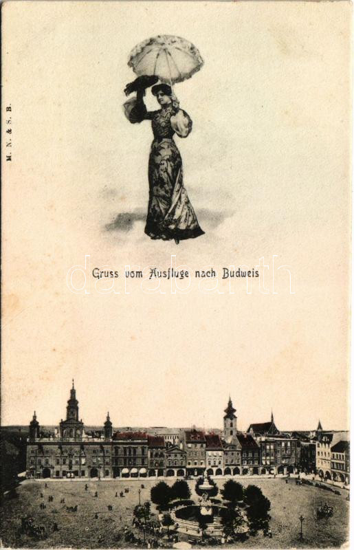 Beschreibung: Ceské Budejovice, Budweis; Gruss vom Ausfluge nach Budweis / main square, market. Montage with lady flying with an umbrella (fl)