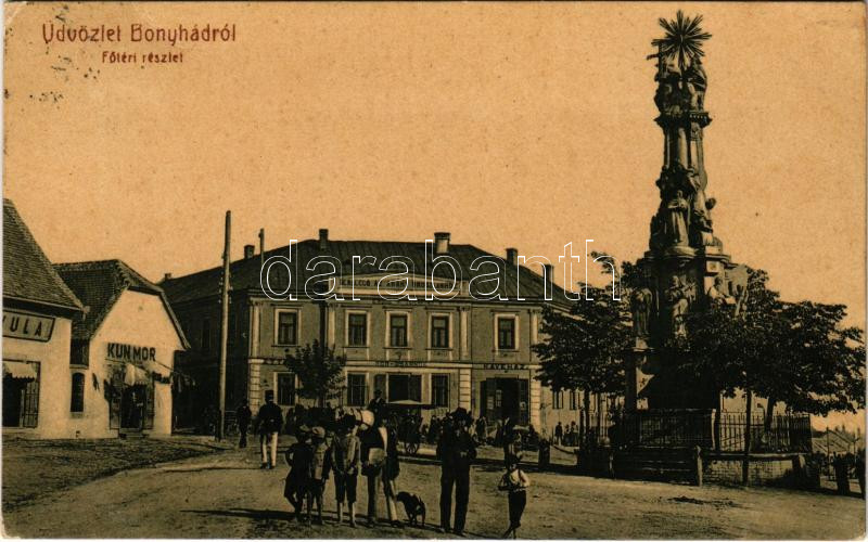 1911 Bonyhád, Főtér, Szálloda az Arany Oroszlánhoz (Erdős Zsigmond), étterem, sörcsarnok és kávéház, Kun Mór üzlete, Szentháromság szobor. W.L. (?) 2687. Hoffer József kiadása (EK)