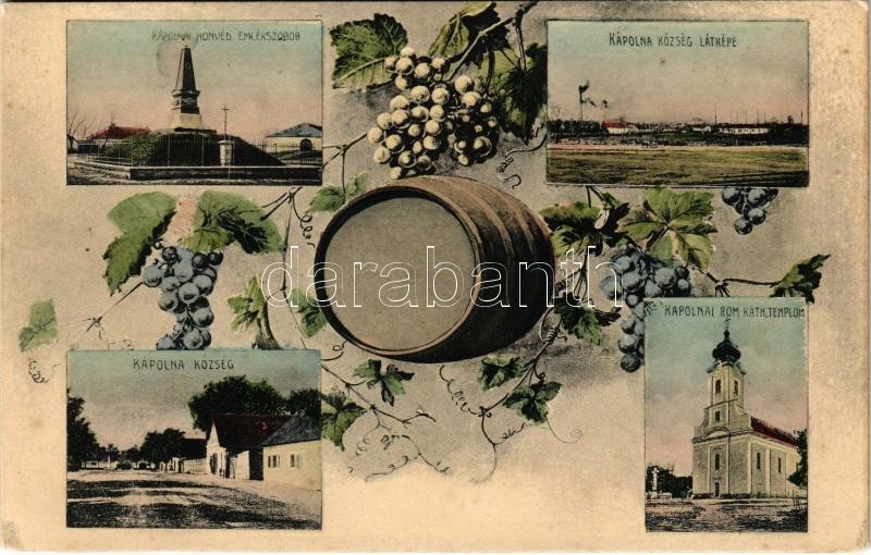 Beschreibung: Kápolna, Honvéd emlékszobor, római katolikus templom. Montázs boros hordóval és szőlővel (EK)