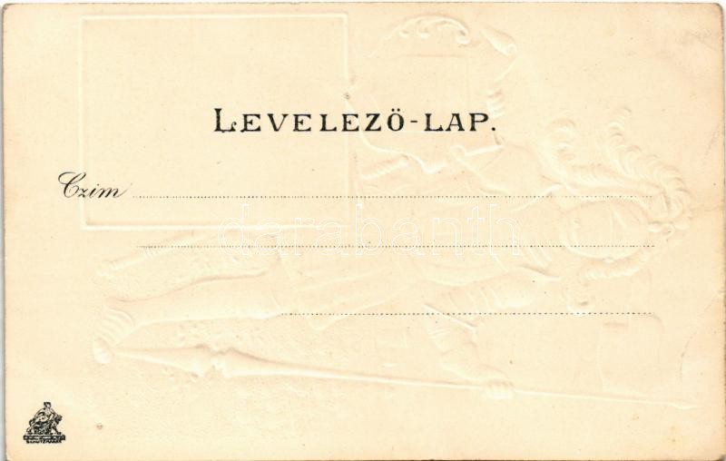 Beschreibung: Mohács, II. Lajos király szobra a Csele pataknál. Dombornyomott szecessziós címeres és zászlós, Art Nouveau litho. Kiadja Weiser Miksa (EK)