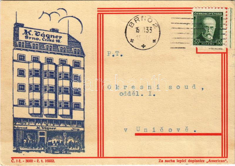 Beschreibung: 1933 K. Vágner Brno / Czech shop advertisement card (ragasztónyom / glue mark)