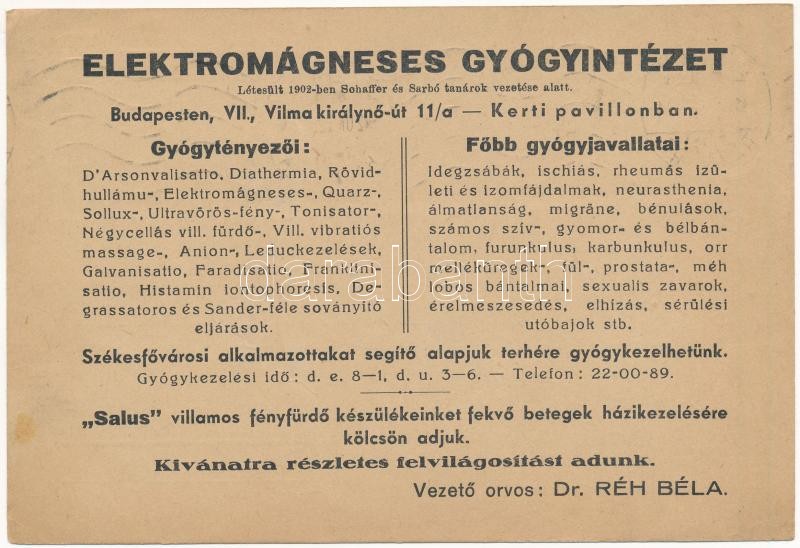 1942 Dr. Réh Béla főorvos Elektromágneses Gyógyintézetének reklámlapja. Budapest VII. Vilma királynő út 11. / Hungarian therapeutic institution advertising card (EK)