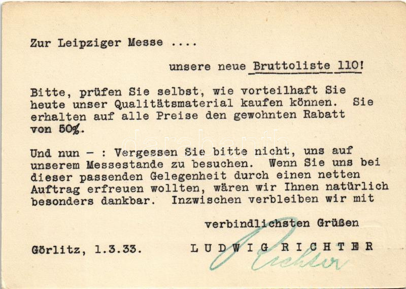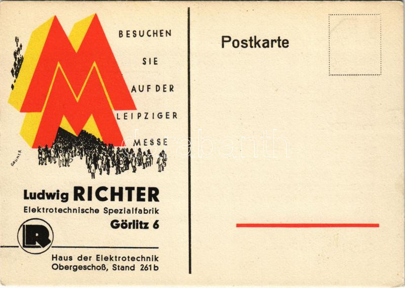 Besuchen sie auf der Leipziger Messe Ludwig Richter Elektrotechnische Spezialfabrik. Haus der Elektrotechnik Obergeschoß, Stand 261b / Leipzig Trade Fair advertisement card s: Gruner (EK)