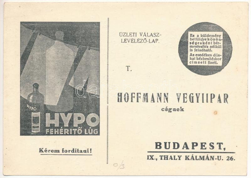 Hypo fehérítő lúg. Hoffmann vegyiipar cég reklámja, hátoldalon megrendelő lap. Budapest, Thaly Kálmán utca 26. / Hungarian chemical company advertisement, order form on the backside (EK)