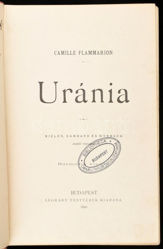 Flammarion, Camille: Uránia. Bieler, Gambard és Myrbach eredeti rajzaival. Bp., 1896, Légrády, (8)+308 p. Harmadik kiadás. Korabeli aranyozott, dombornyomott egészvászon-kötésben, kissé kopott, sérült borítóval, néhány kissé foltos lappal, korabeli ajándékozási bejegyzéssel.