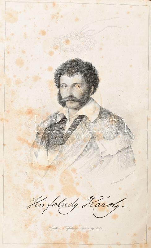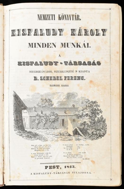 Kisfaludy Károly minden munkái. A Kisfaludy-Társaság megbízásából szerkeszté s kiadta: D. Schedel Ferenc. Pest, 1843, Kisfaludy-Társaság, 1 t. (címkép) +XX+1050 hasáb+(1) p.+1051-1064 hasáb+(1) p. Viseltes félvászon-kötésben, sérült, kopott borítóval, hiányos, szétvált gerinccel, helyenként sérült, foltos, a fűzéstől elváló lapokkal.