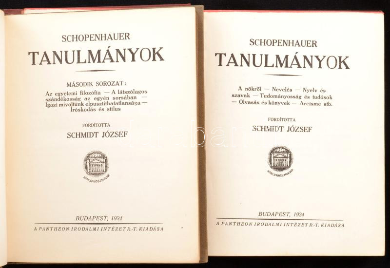 Schopenhauer, [Arthur]: Tanulmányok. I-II. köt. Ford.: Schmidt József.... https://www.darabanth.com/de/429-Fernauktion/429.0/Bucher/Bucher-Andere-kuriositaten~1000026/Schopenhauer-Arthur-Tanulmanyok-I-II-kot-Ford-Schmidt-Jozsef-Bp-1924-Pantheon-Globu~II2749218