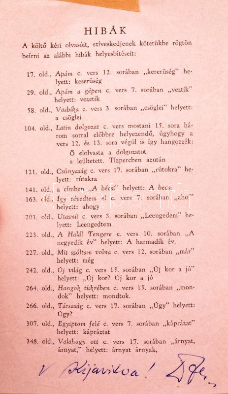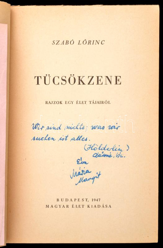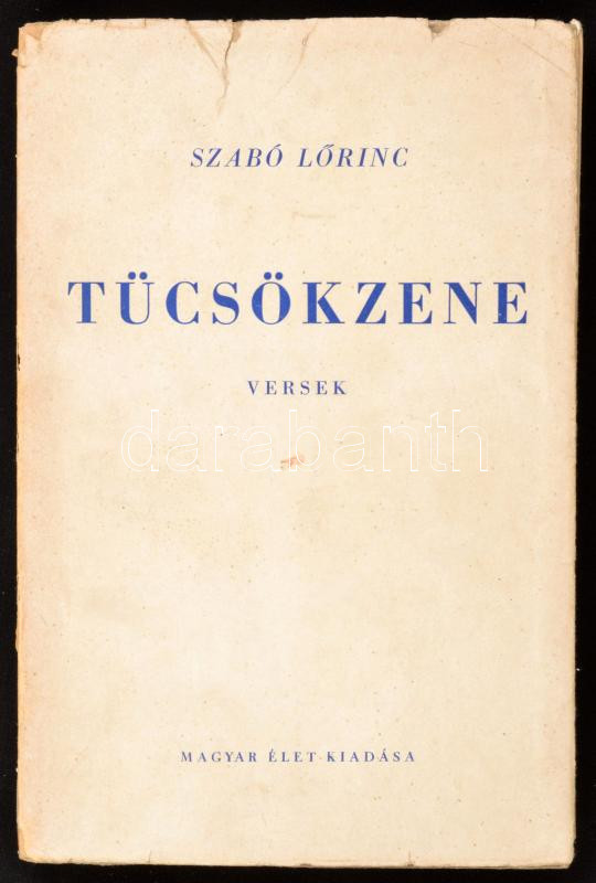 Szabó Lőrinc: Tücsökzene. Rajzok egy élet tájairól. (Versek). Bp., 1947, Magyar Élet, 368 p. Első kiadás! Kiadói papírkötés, sérült kiadói papír védőborítóban, az előzéklapon a kötetben található hibák jegyzékével, a címlapon ajándékozási bejegyzéssel.