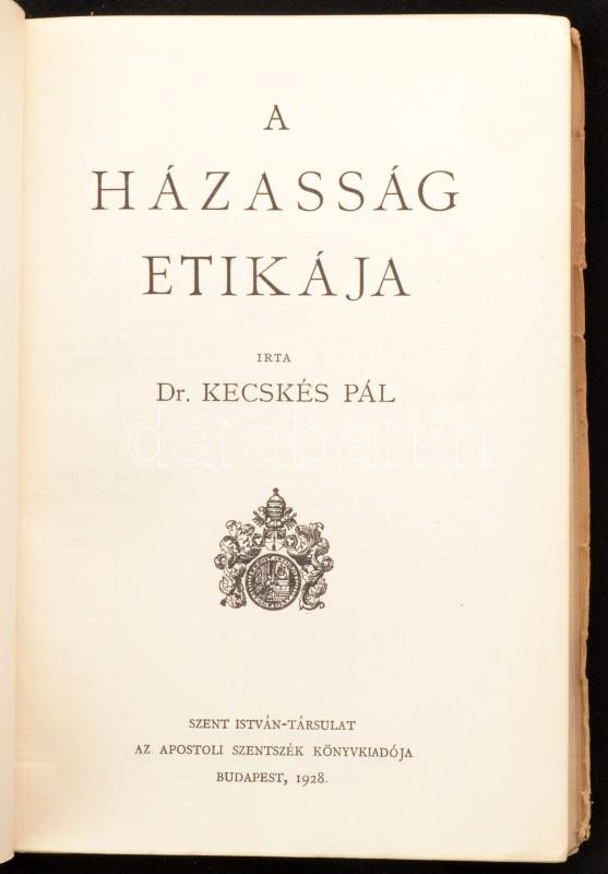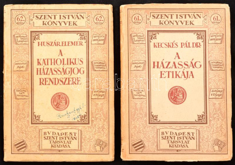 Szent István Könyvek 2 kötete: Dr. Kecskés Pál: A házasság etikája (61. sz.); Huszár Elemér: A katholikus házasságjob rendszere (62. sz.) Bp., 1928, Szent István-Társulat. Kiadói papírkötés, kissé sérült borítóval, tulajdonosi névbejegyzéssel.