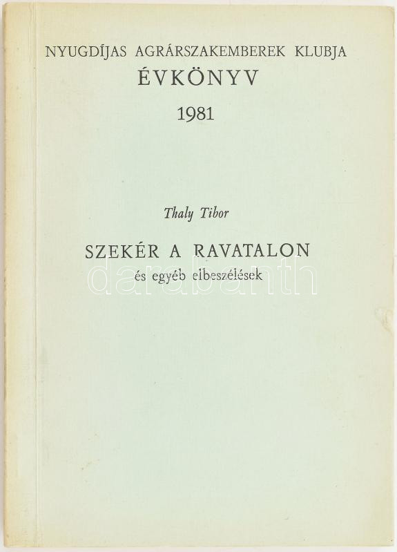 Thaly Tibor: Szekér a ravatalon és egyéb elbeszélések. Bp.,1981., Nyugdíjas Agrárszakemberek Klubja. Egyetlen kiadás. Kiadói papírkötés. Megjelent 1000 példányban.
