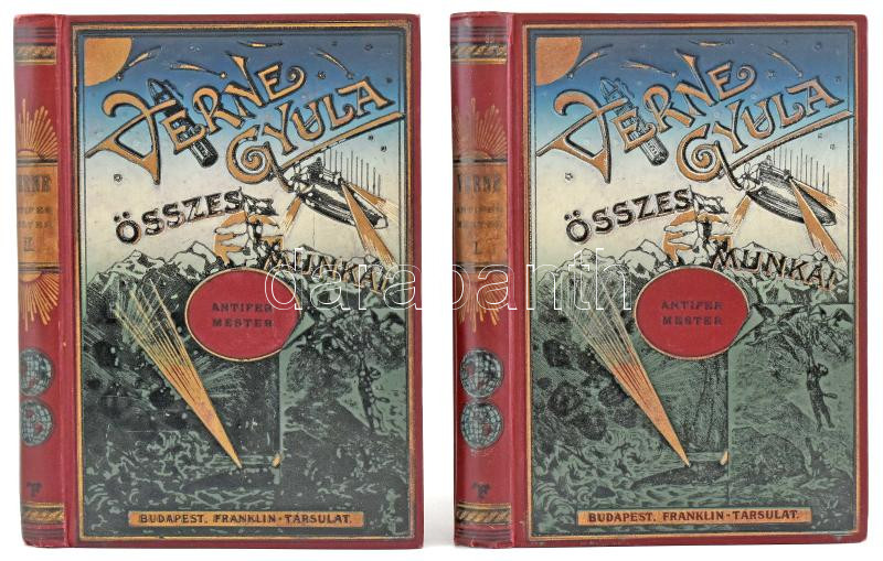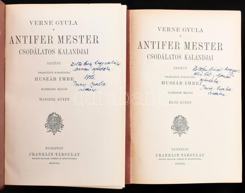 Verne Gyula: Antifer mester csodálatos kalandjai. I-II. köt. Ford.: Huszár Imre. Harmadik kiadás. Bp.,é.n.,Franklin, 197; 2+199-378 p. Számos képpel gazdagon illusztrálva. Kiadói illusztrált, aranyozott, festett egészvászon-kötésben, ajándékozási bejegyzéssel, jó állapotban