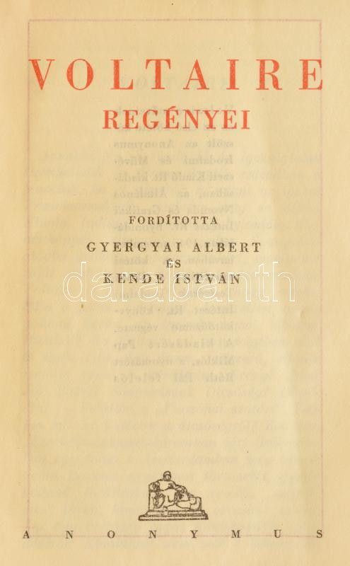 Voltaire regényei. Ford.: Gyergyai Albert, Kende István. Voltaire műve... https://www.darabanth.com/de/429-Fernauktion/429.0/Bucher/Bucher-Andere-kuriositaten~1000026/Voltaire-regenyei-Ford-Gyergyai-Albert-Kende-Istvan-Voltaire-muvei-I-Bp-1945-Anonymus-~II2747637