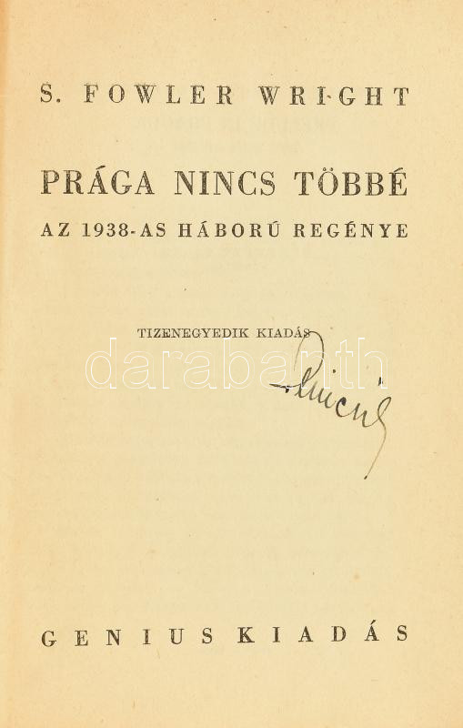 Wright, Sydney Fowler: Prága nincs többé. Az 1938-as háború regénye. Ford.: Ferenczy Valér. Bp., 1937, Genius (Révai-ny.), 285 p. Sérült kiadói papírkötés, az eredeti papír védőborító fülrésze a hátsó borítóra ragasztva.