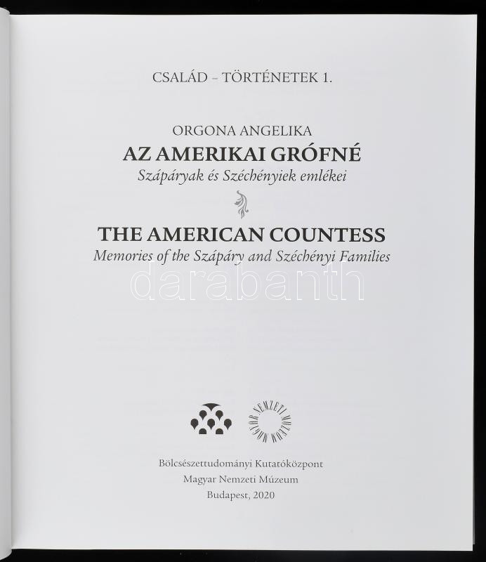 Orgona Angelika: Az amerikai grófné. Szápáryak és Szécnényiek emlékei. Család-Történetek 1. The American Countess. Memories of the Szápáry and Széchényi families. Family-Histories 1. Bp., 2020, Bölcsészettudományi Kutatóközpont - Magyar Nemzeti Múzeum. Gazdag képanyaggal illusztrált. Magyar és angol nyelven. Kiadói kartonált papírkötés.