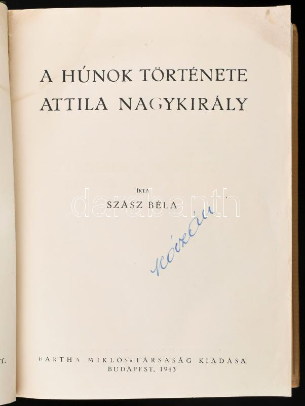 Szász Béla: A húnok története. Attila nagykirály. Bartha Miklós-Társaság Magyartörténeti Szakosztályának kiadványai V. Bp., 1943, Bartha Miklós-Társaság, (Bethlen Gábor-ny.), 632 p.+10 t. (fekete-fehér képtáblák, közte 4 kihajtható) + 16 (térkép) t. + 1 ( kihajtható genealógiai táblázat) t. Első kiadás. Átkötött félvászon-kötés, foltos lapokkal.