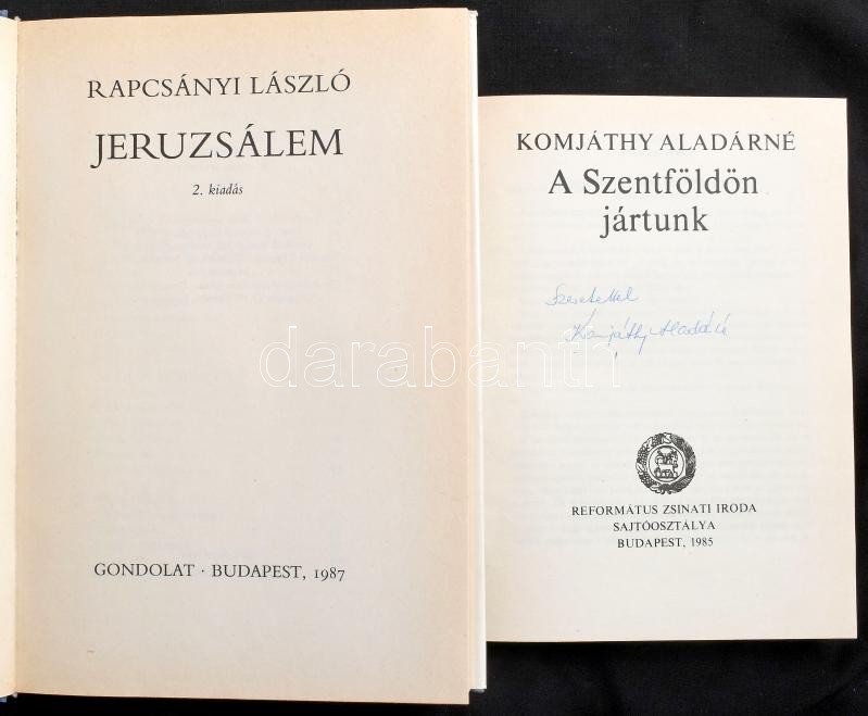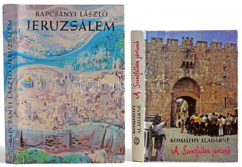 2 db Izrael / Szentföld témájú könyv: Komjáthy Aladárné: A Szentföldön jártunk. Bp., 1985, Református Zsinati Iroda Sajtóosztálya. Számos fotóval illusztrálva. Kiadói kartonált papírkötés, kissé kopott borítóval. A szerző által DEDIKÁLT példány. + Rapcsányi László: Jeruzsálem. Bp., 1987, Gondolat. Második kiadás. Kiadói egészvászon-kötés, kissé sérült, ragasztott kiadói papír védőborítóban.