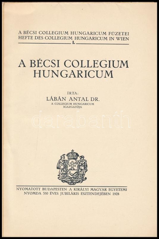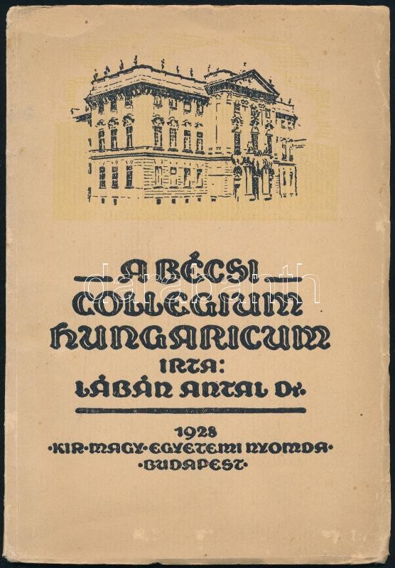 Lábán Antal: A Bécsi Collegium Hungaricum. A Bécsi Collegium Hungaricum Füzetei I. Bp., 1928., Kir. M. Egyetemi Nyomda. Fekete-fehér fotókkal illusztrált. Kiadói papírkötés, kissé kopott, kissé szakadt borítóval.