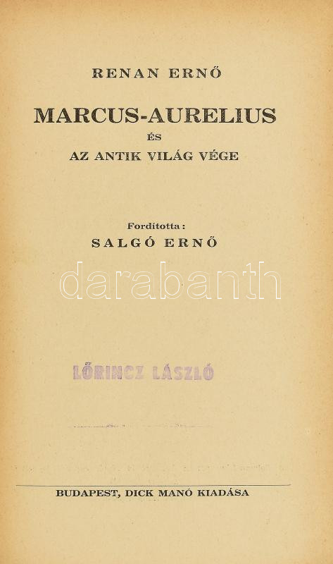 Renan, [Ernest] Ernő: A kereszténység eredetének története. I-VII. köt. [Teljes!] (1. Jézus élete. 2. Az apostolok. 3. Szent Pál. 4. Az antikrisztus. 5. Az Evangeliumok és a második keresztény nemzedék. 6. A keresztény egyház. 7. Marcus-Aurelius és az antik világ vége.) Ford.: Salgó Ernő. Bp., [1928], Dick Manó (Budapesti Hirlap-ny.), LXXXI+382 p., XLVII+259+(1) p., LVI+382 p., XXXVIII+389+(2) p., XXVII+384 p., IX+394 p., VIII+459+(1) p. Kiadói aranyozott egészvászon sorozatkötésben, néhány kötet kissé kopott, egy foltos borítóval, egyébként jó állapotban, tulajdonosi névbélyegzővel.
