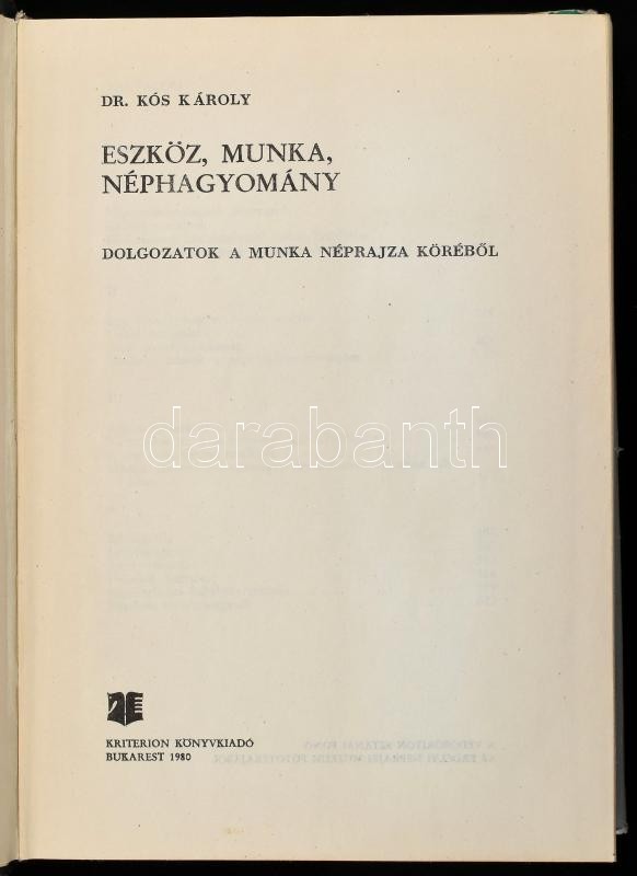 Dr. Kós Károly: Eszköz, munka, néphagyomány. Dolgozatok a munka népraj... https://www.darabanth.com/de/429-Fernauktion/429.0/Bucher/Bucher-Sozialwissenschaften~1000019/Dr-Kos-Karoly-Eszkoz-munka-nephagyomany-Dolgozatok-a-munka-neprajza-korebol-Bukarest-~II2720298