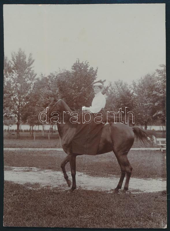 Beschreibung: 1905 Nagyvárad, Burza Károlyné a Muci lovon a nagyváradi honvéd hadapródiskolában, 13,5×10 cm