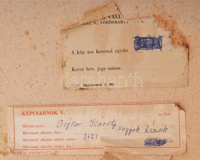 Bojtor Károly (1933-1999): Hegyek, házak. Olaj, farost, jelezve balra lent. Hátoldalán autográf felirattal és Képcsarnok Vállalat címkéivel. Üvegezett, kissé sérült fakeretben. 60x80 cm.
